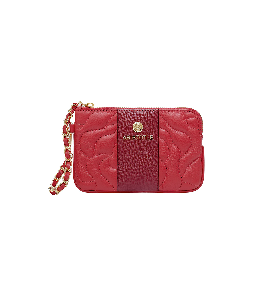 Aristotle rose bag Model Name : Wristlet Color : Fuchsia Description 100% Genuine leather 100% Brass (gold) Width 18 CM X Height 12 CM Leather and Chain strap long 25 CM Colors : 1.Baby Pink 2.Baby Sky 3.Black 4.Fuchsia 5.Lavender 6.Red1.Black